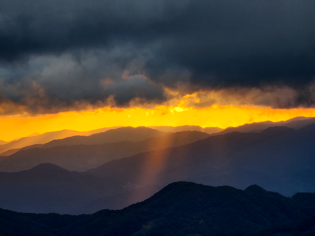 월여산(앞)과 뒤에 오전에 억새 보러 올랐던 황매산 조망