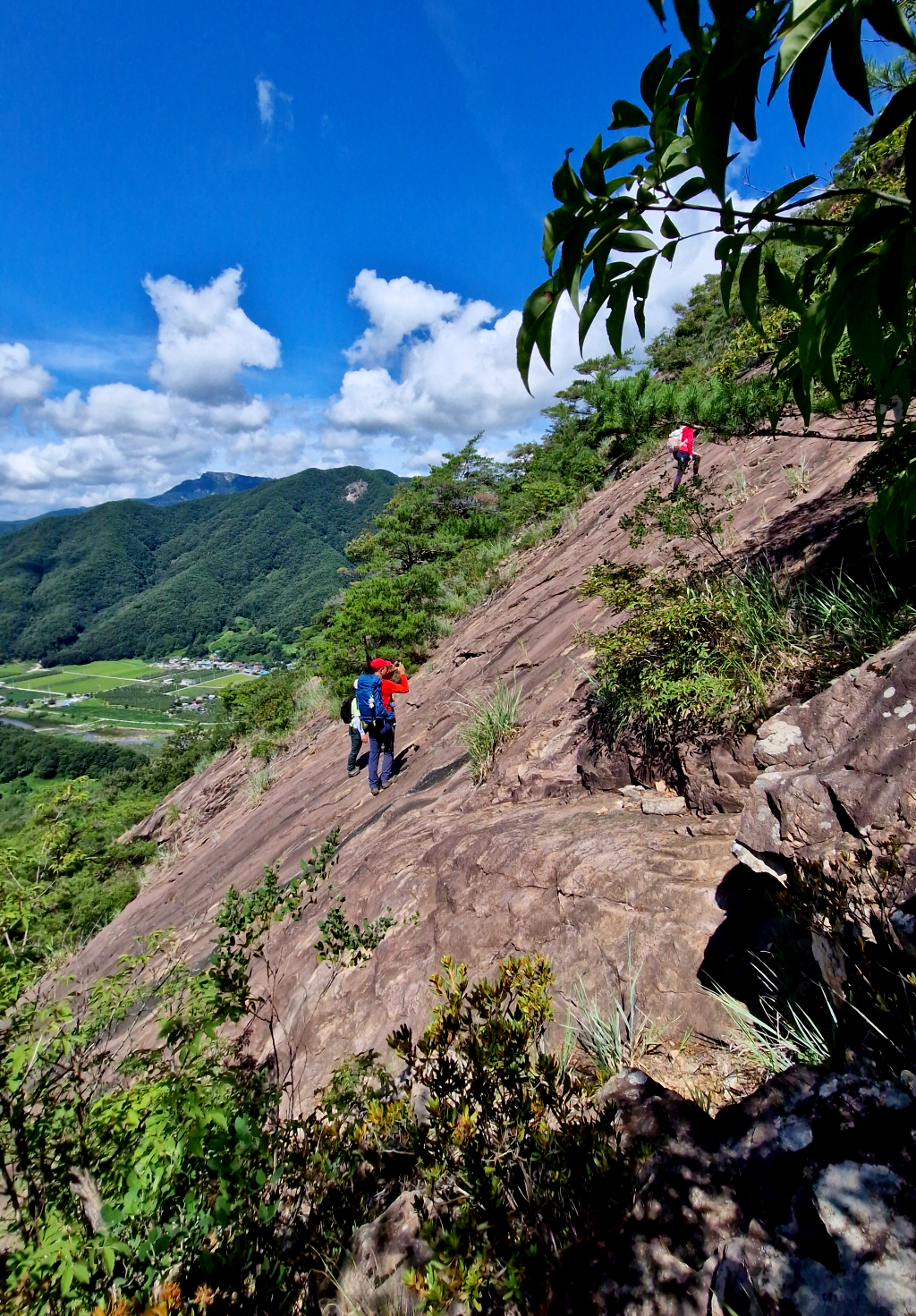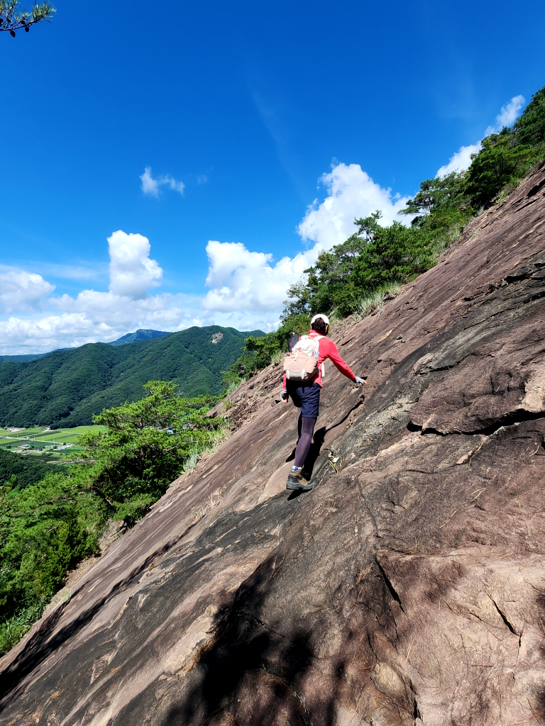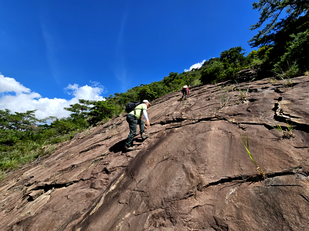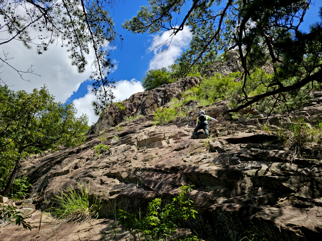 슬랩은 경사각이 만만치 않지만 바위가 미끄럽지않고 홈이많아 어렵지않게 오를수 있습니다.