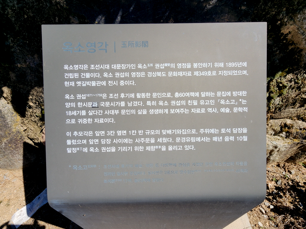 옥소영각(玉所影閣)은 조선시대 대문장가인 옥소 권섭의 영정을 봉안하기 위해 1895년에 건립된 건물이라는