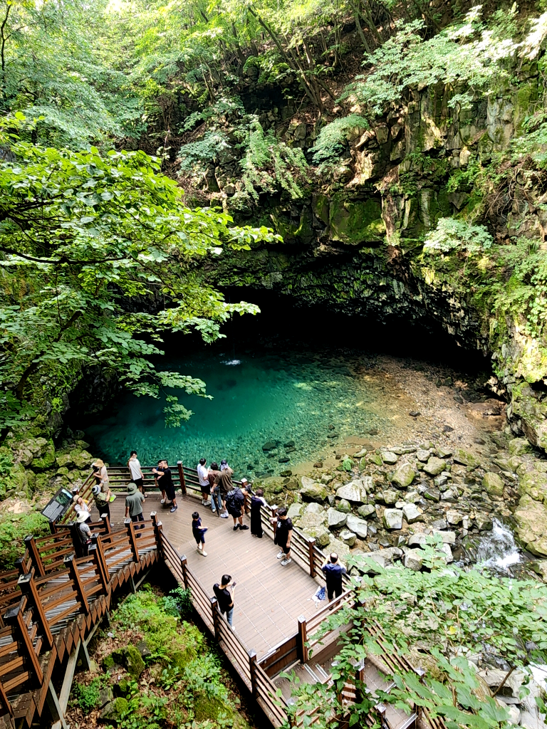 가물어서 폭포수가 실처럼 떨어지고 있지만 물은 에메랄드 옥빛이네요
