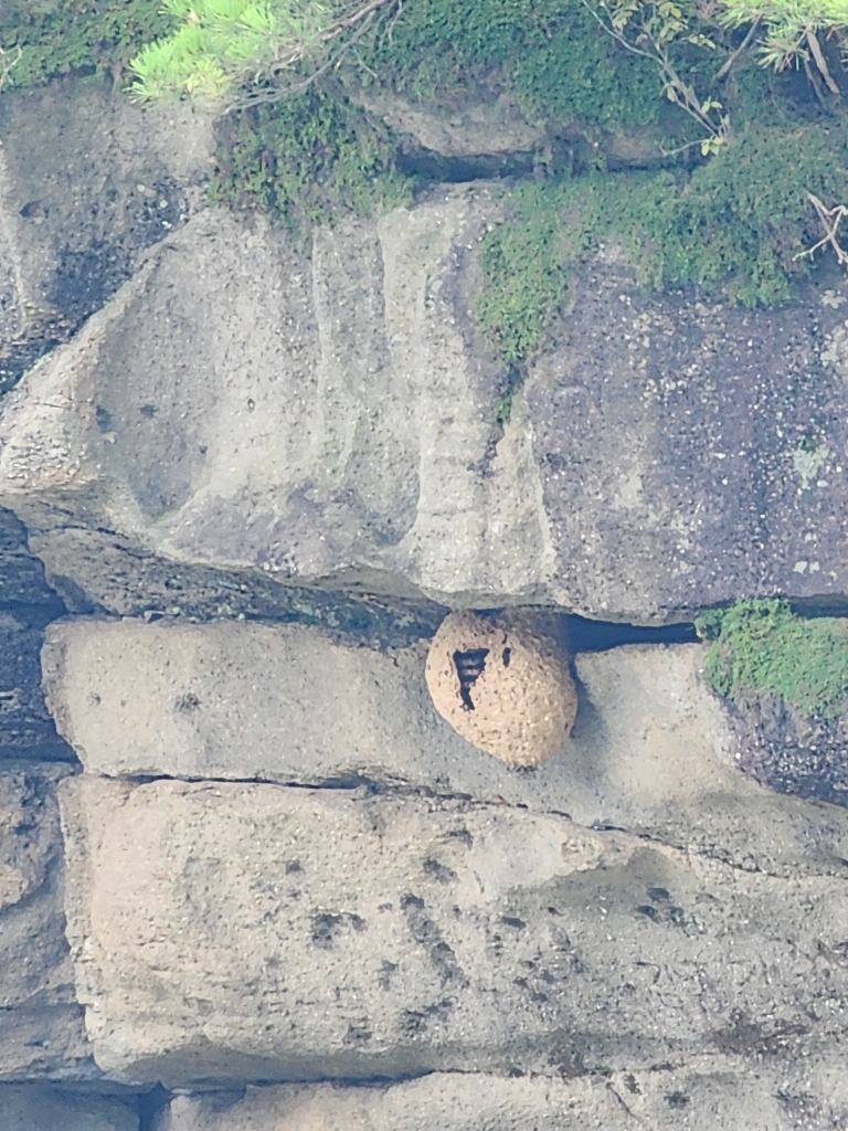 고석바위에 매달린 저것이 말벌집일까요? 벌은 보이지 않는데...