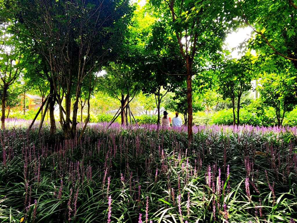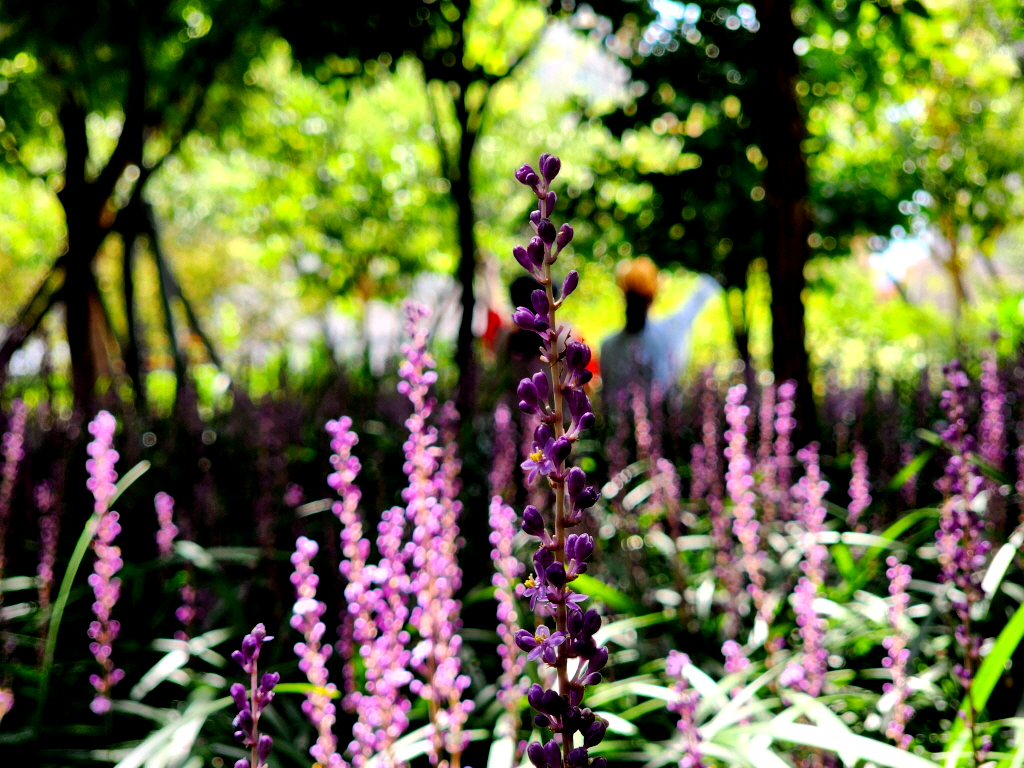 그 아래에 보라색 맥문동 꽃이 이쁘게 피어있습니다.