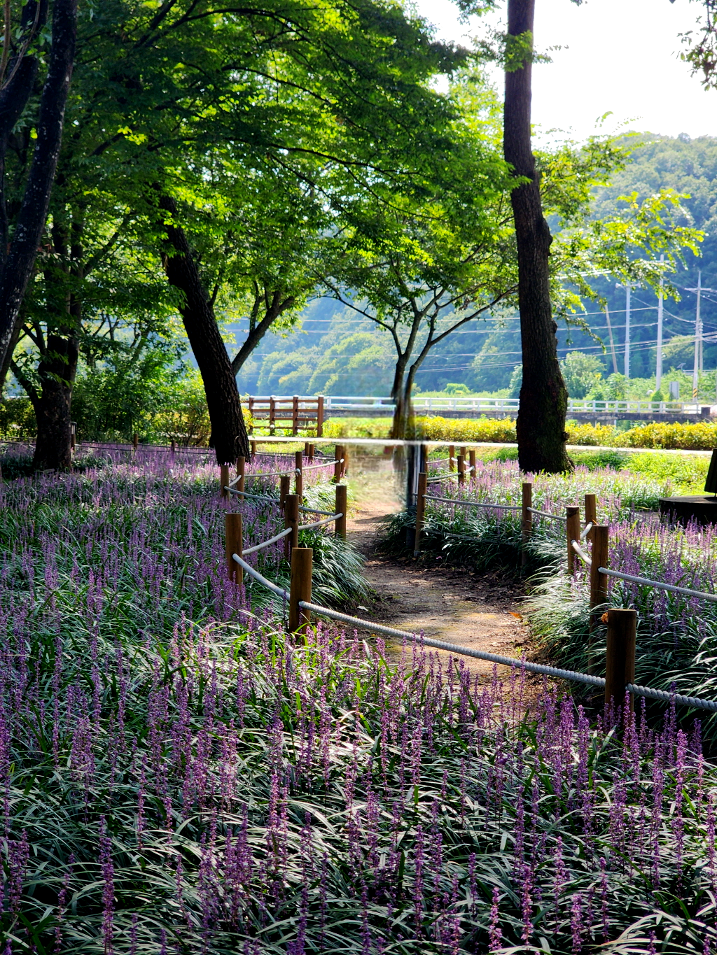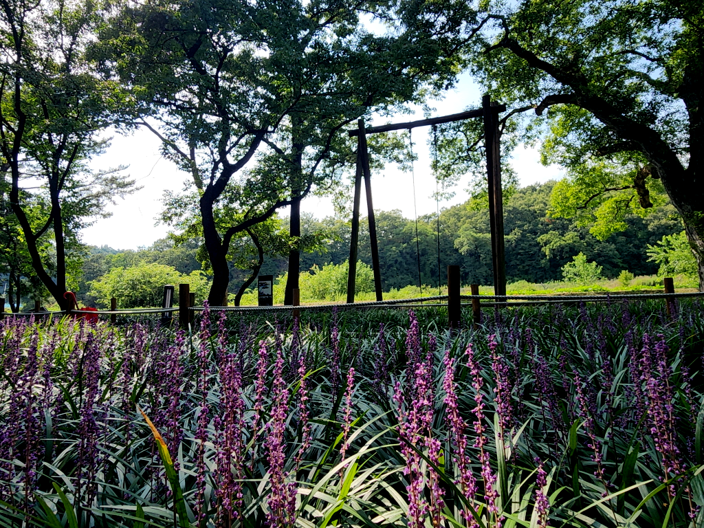 오리장림 숲 사이로 S자를 그리며 맥문동이 피어 있습니다.