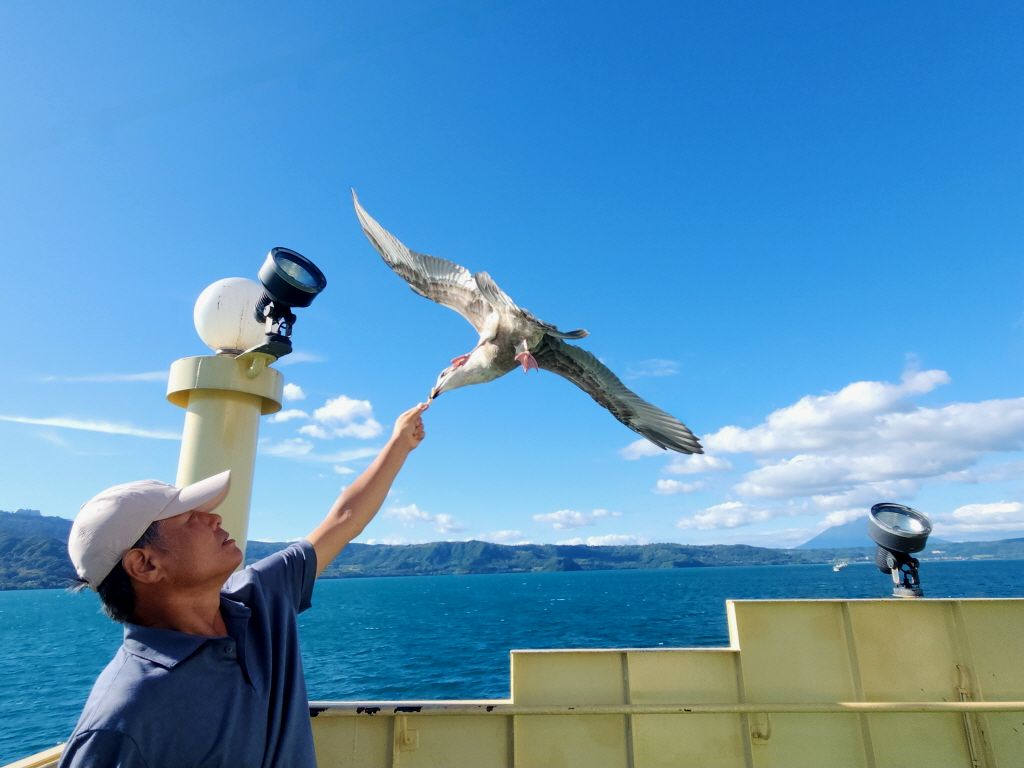 친구들이 맥주 안주로 먹을려고 구입한 일본 새우깡(?)을 가져와 갈매기에게 줘 봅니다.