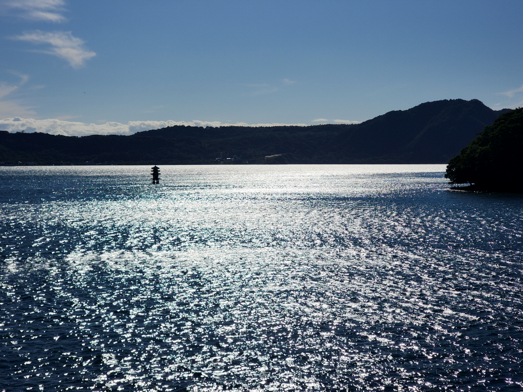 호수 중앙에는 나카지마섬이 있고 호수 주변은 1,000급 산들로 둘러싸여 있다고 합니다.