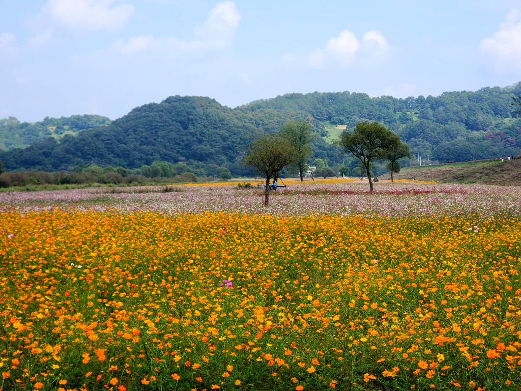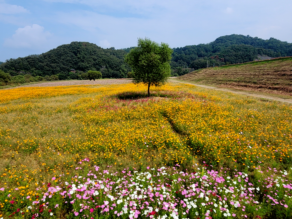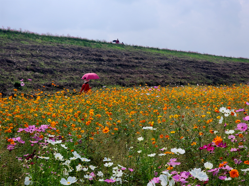 둑방에서 내려다본 코스모스 꽃밭