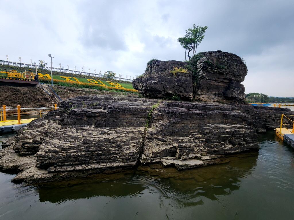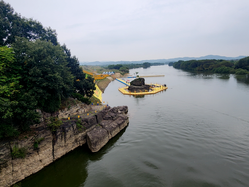 정암루 아래 남강에 위치한 솥바위 정암(鼎岩), 鼎 : 솥 정