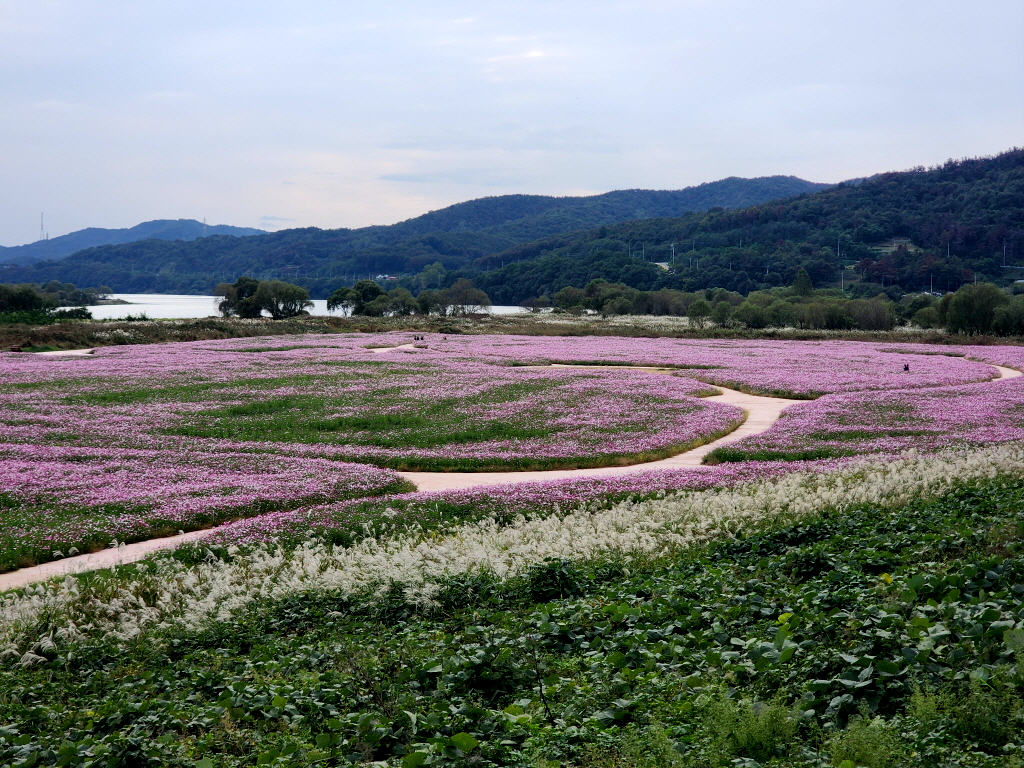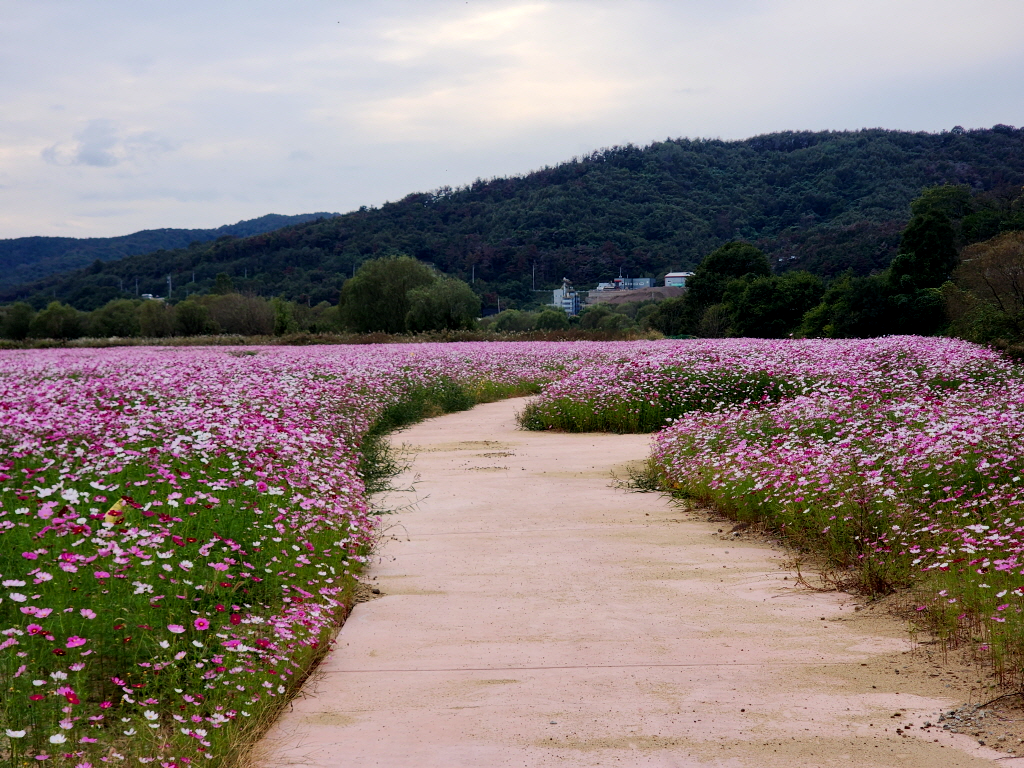 둑방에서 내려와 꽃밭사이로 들어갑니다.