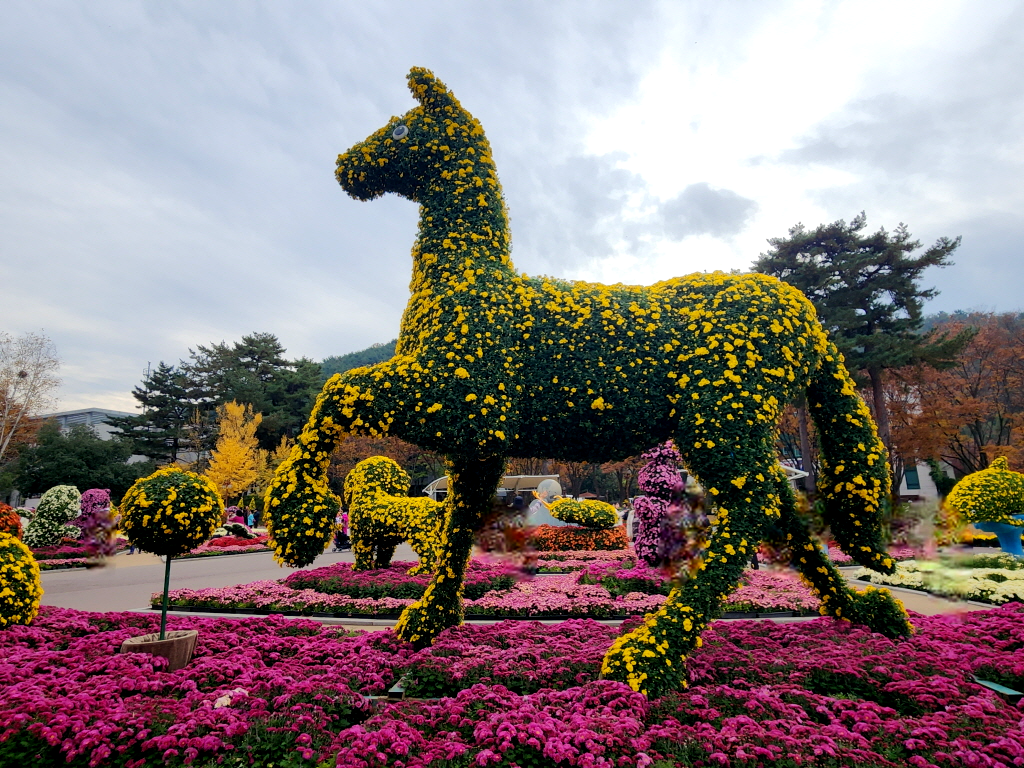 말 조형물에는 조금 덜 피었네요