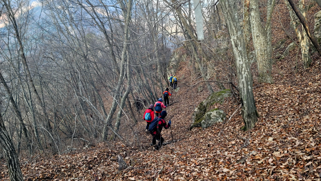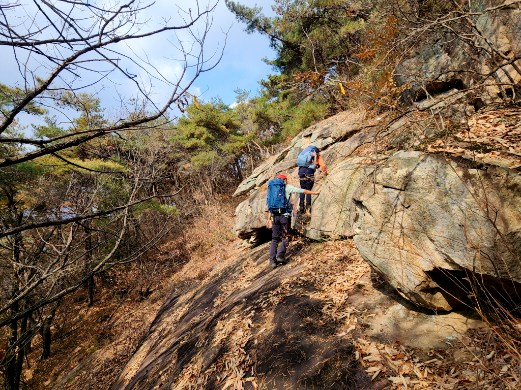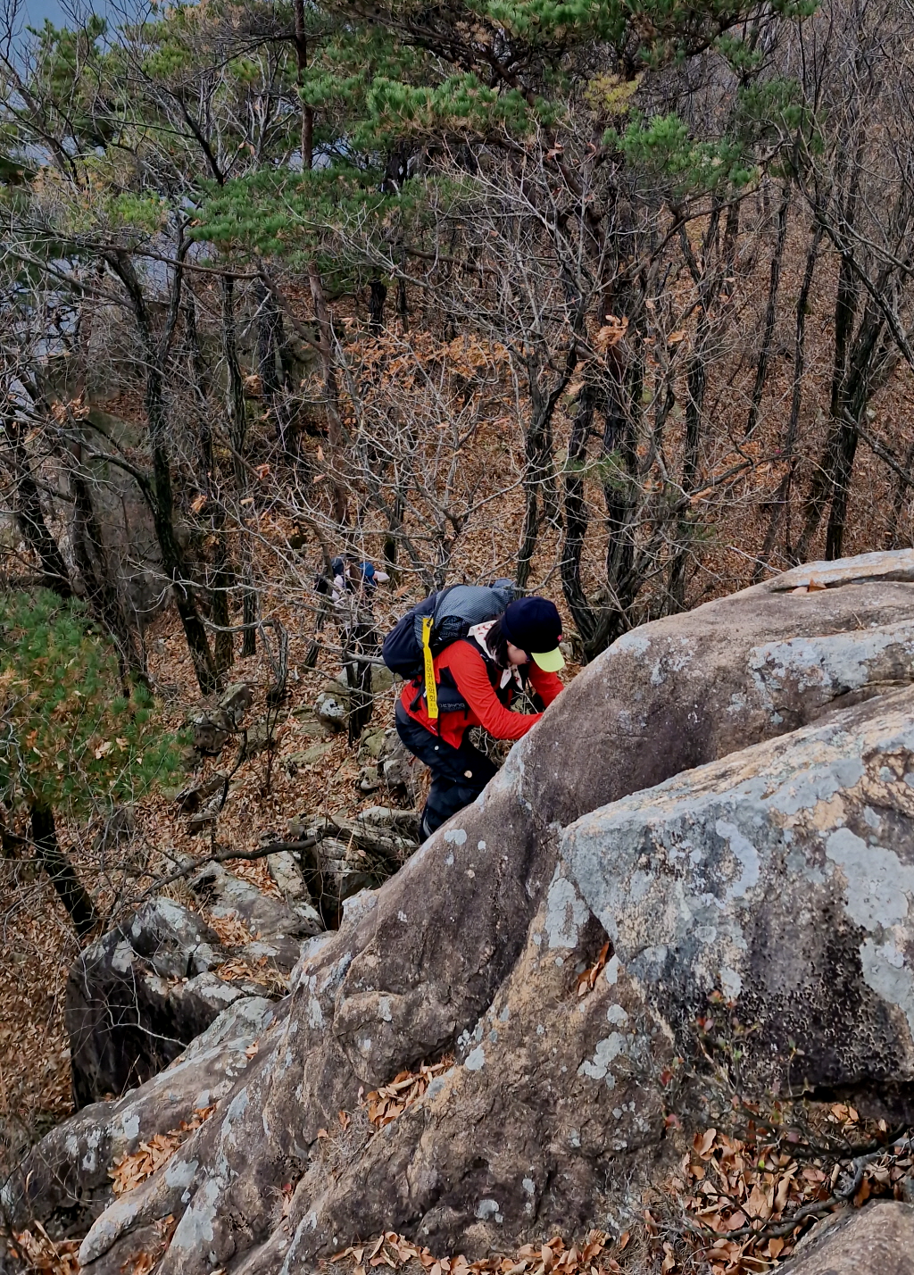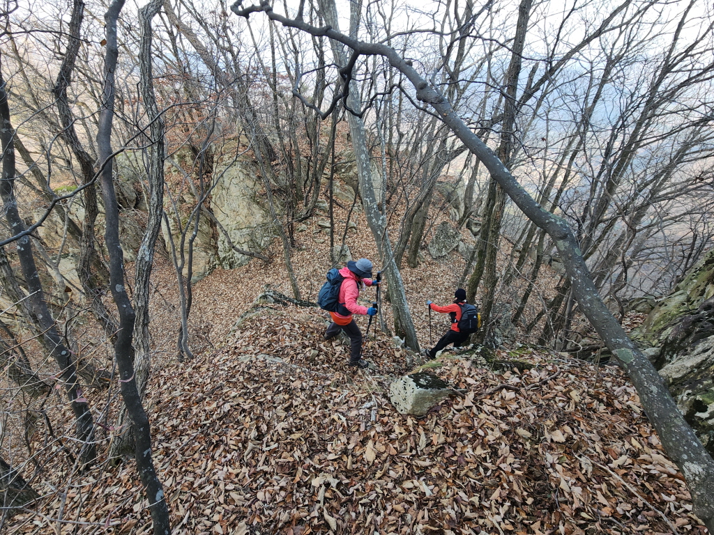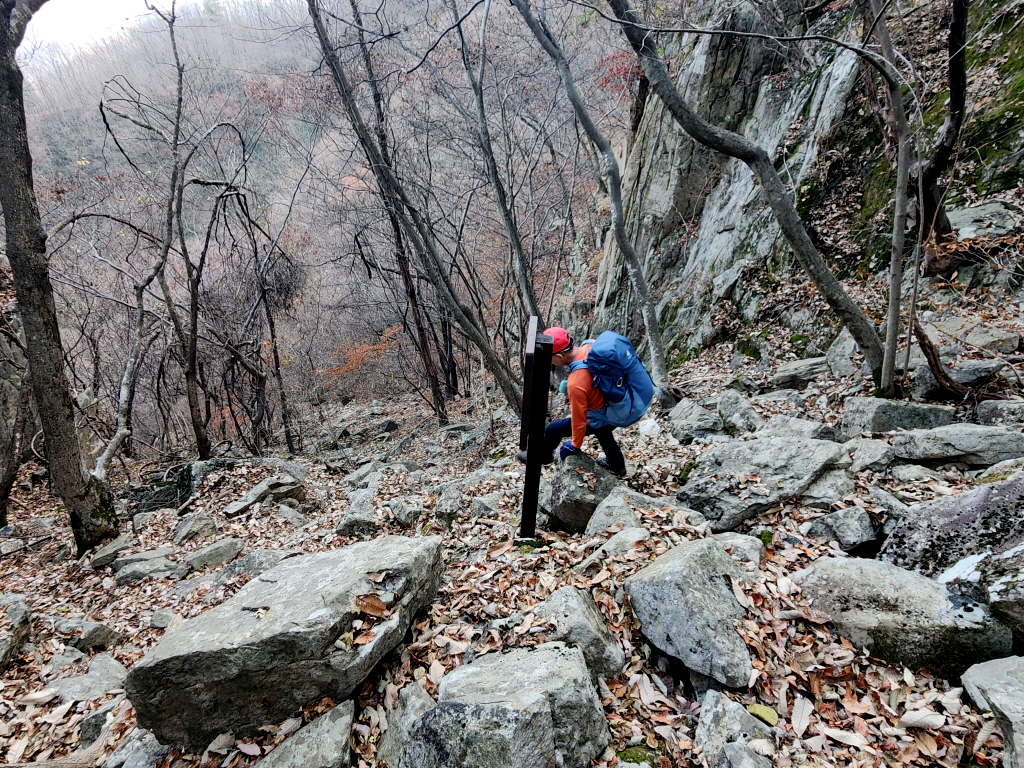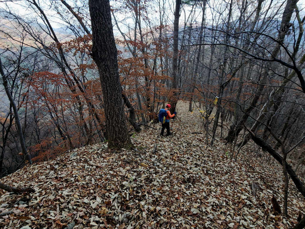 낙엽쌓인 급경사에 너들길인 완전 악조건의 등로를 내려갑니다.