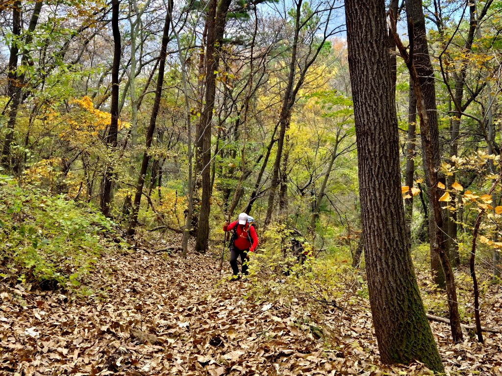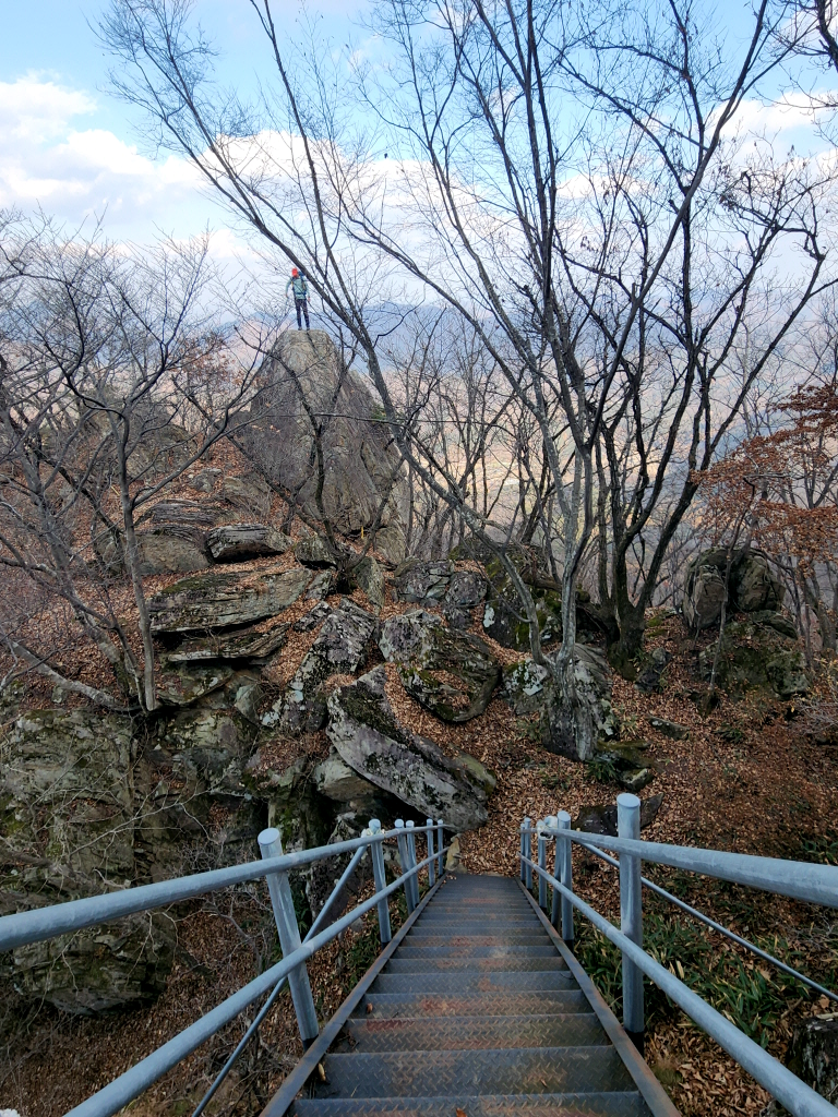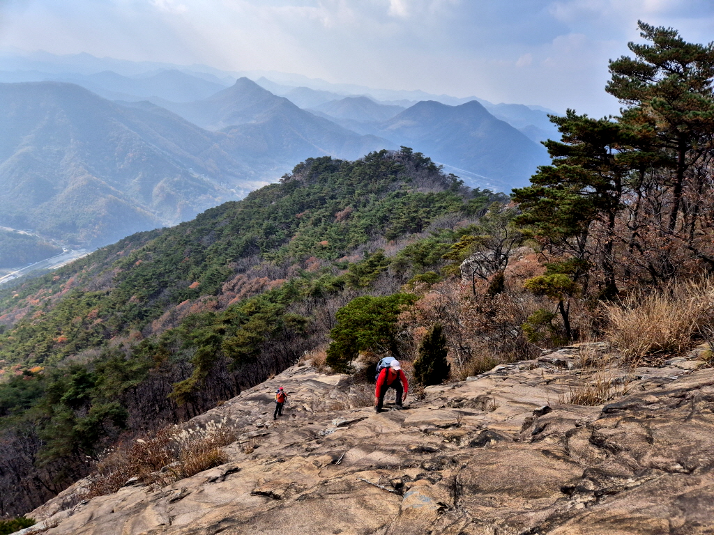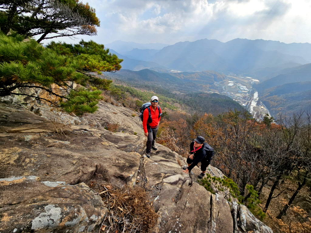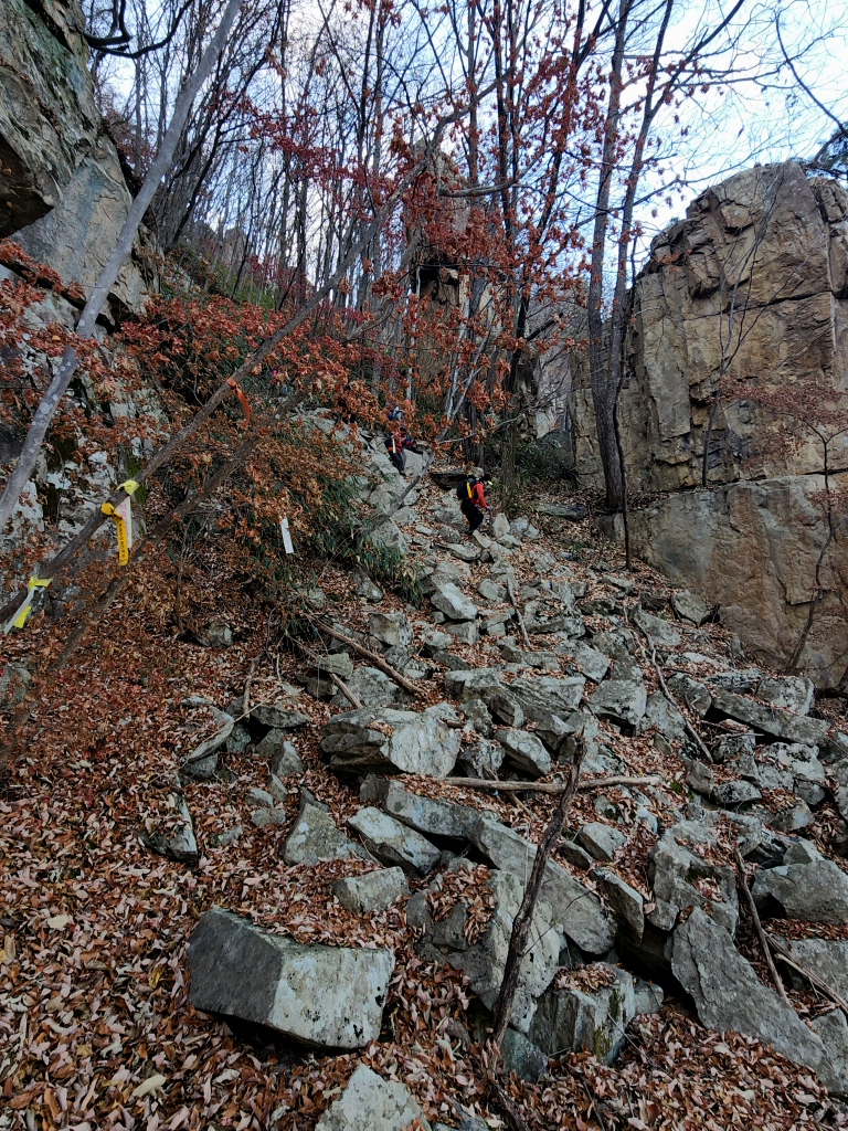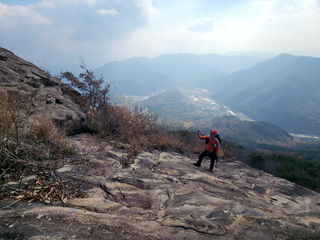 낙엽쌓인 급경사에 너들길인 완전 악조건의 등로를 내려갑니다.