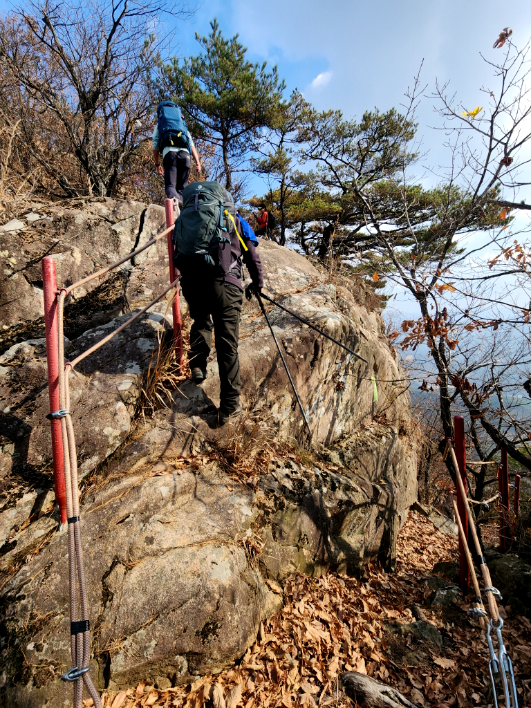 천등산까지 바위를 우회하는 등로가 있고 바위를 통과해야 되는 구간은 안전시설이 있으니