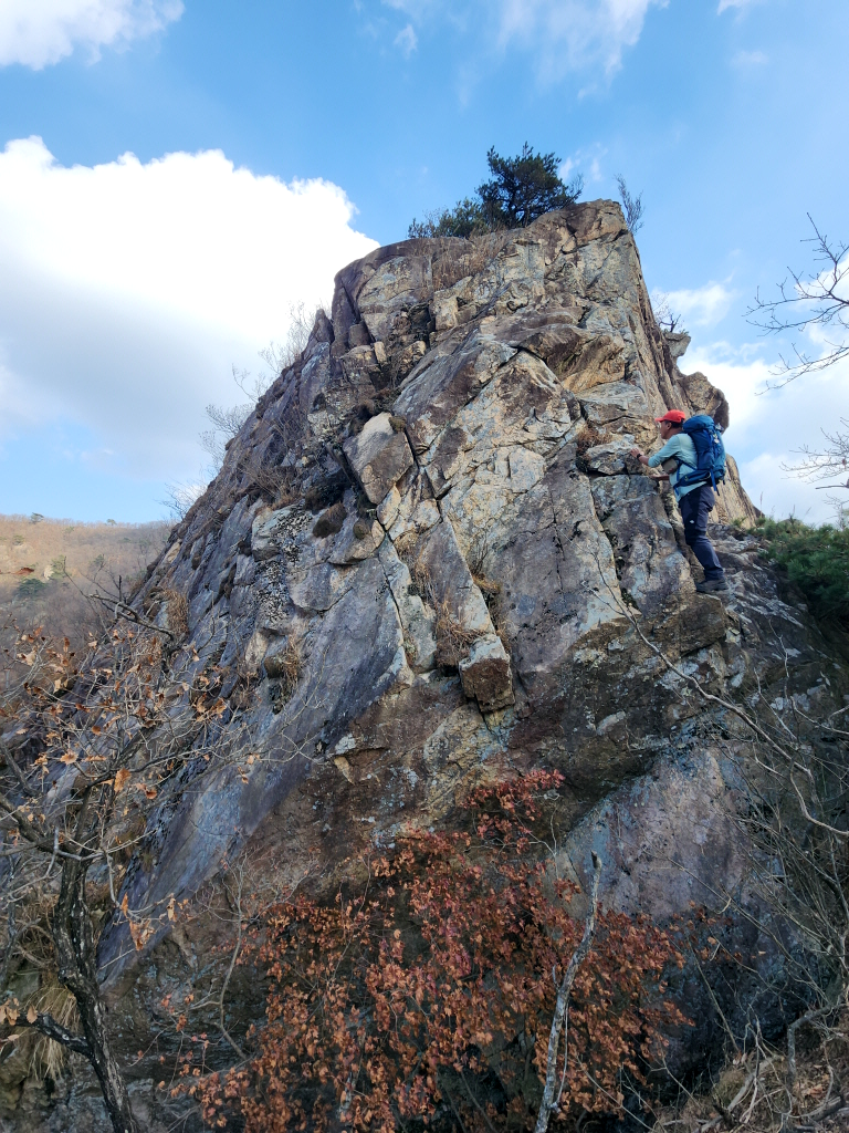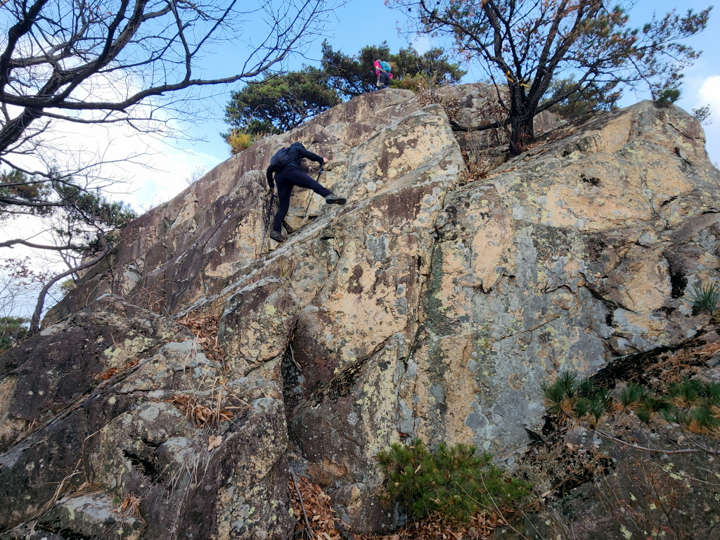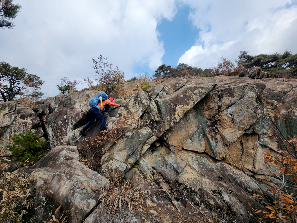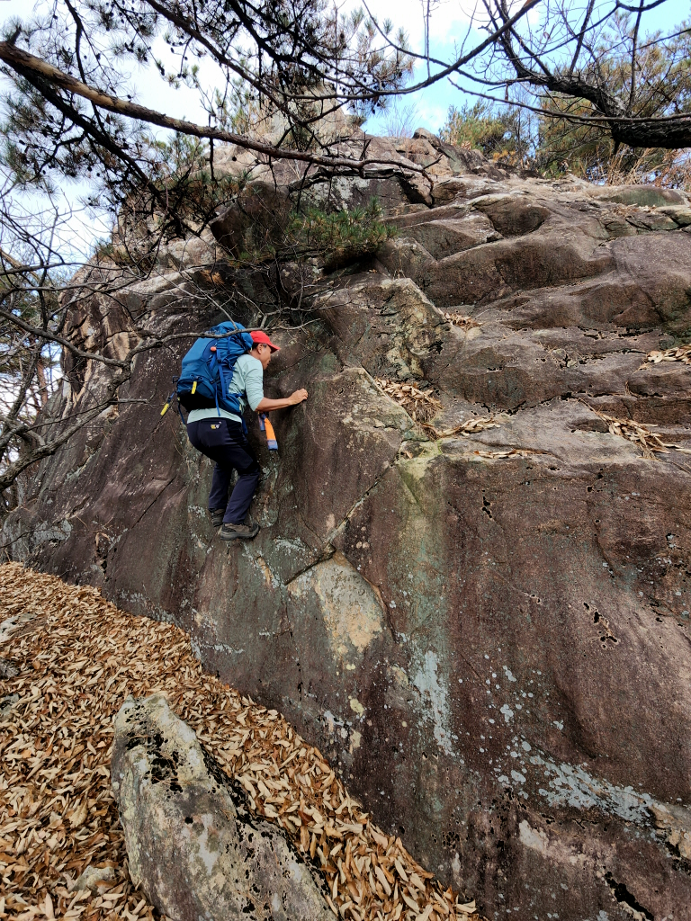 천등산 오름중 이 암릉을 오를수 있을까싶어 붙어보지만 불가능이라 포기하고