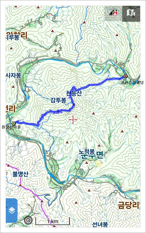 ◈ 산행코스 : 원장선마을 - 큰대골 - 감투봉 - 천등산 - 수덕골 - 고산촌경로회관