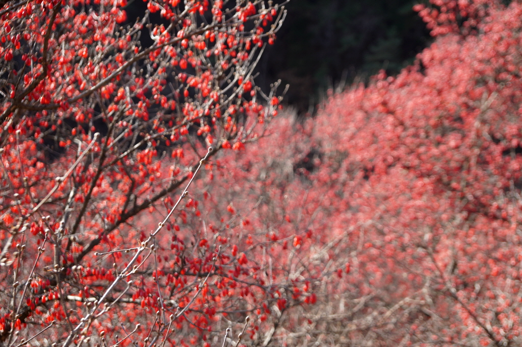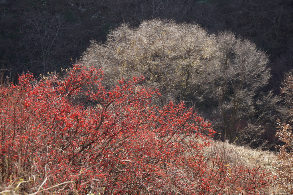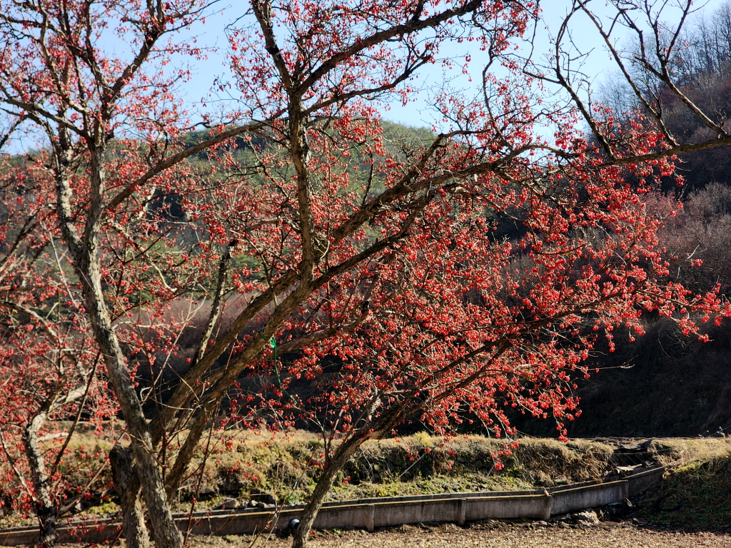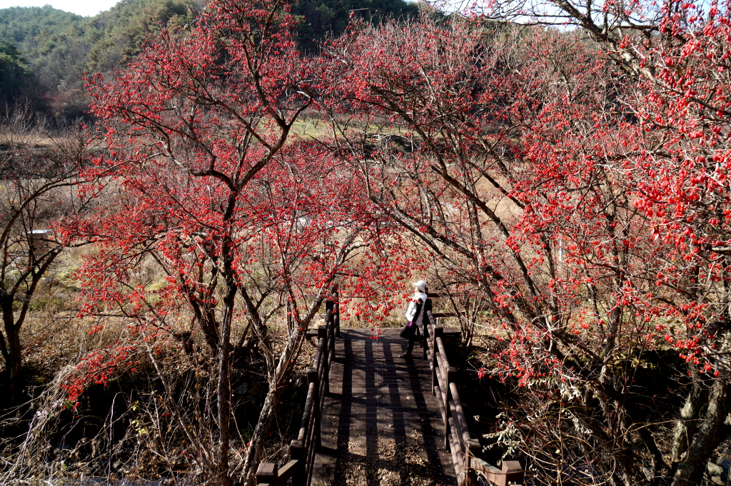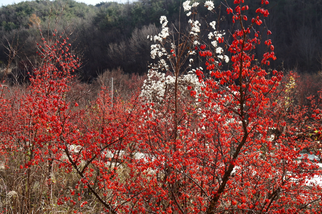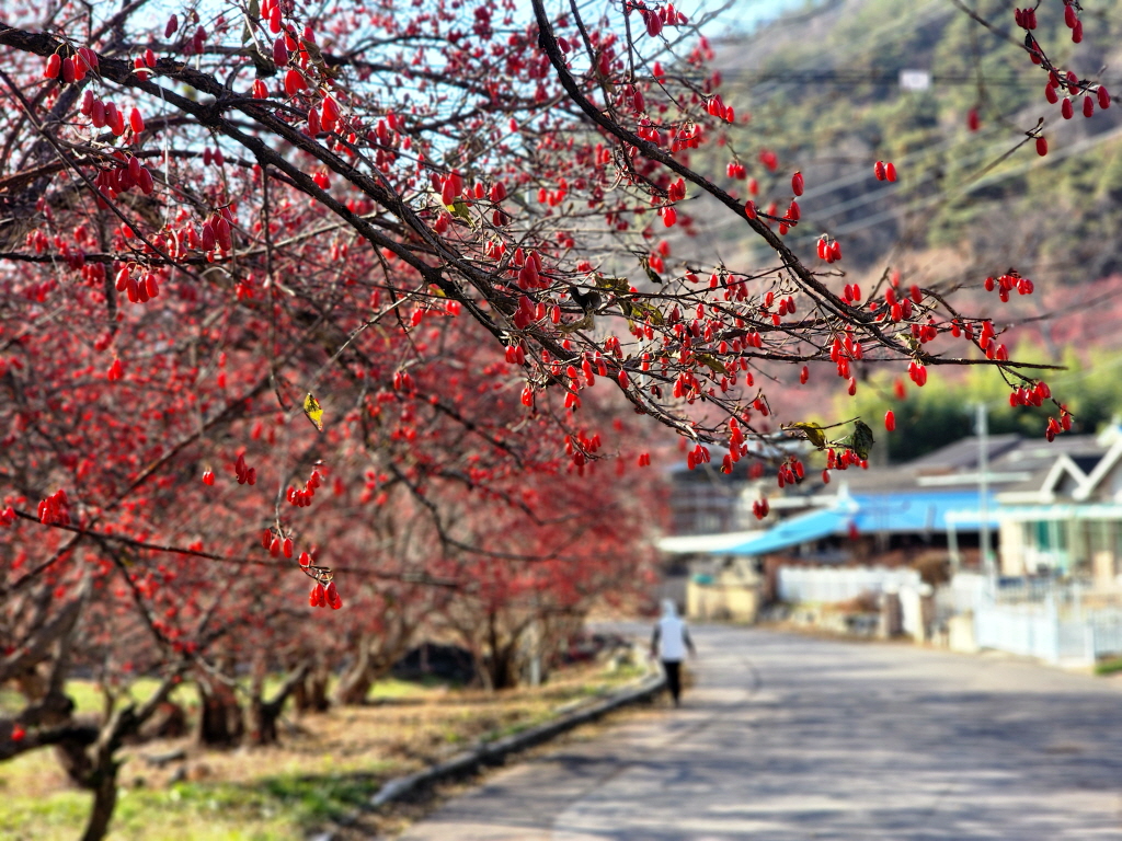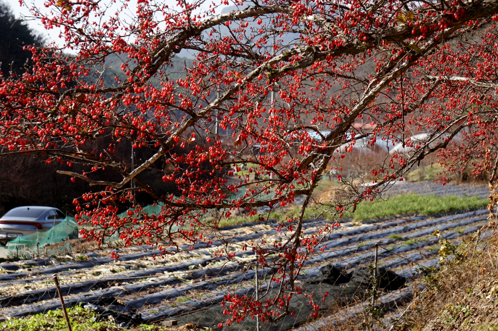 봄이면 온통 노란색으로 물드는 의성 산수유마을에 늦가을 붉은 꽃이 활짝 피었습니다.