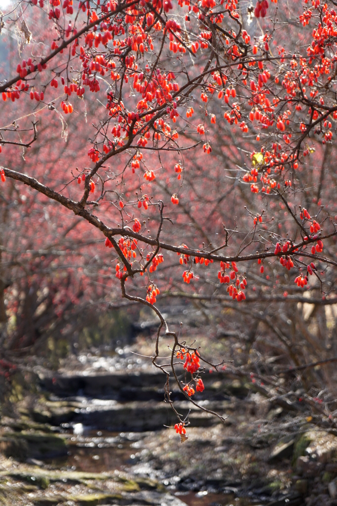 봄에 노란 산수유 꽃길따라 붉은 산수유 열매가 주렁주렁 달렸습니다.