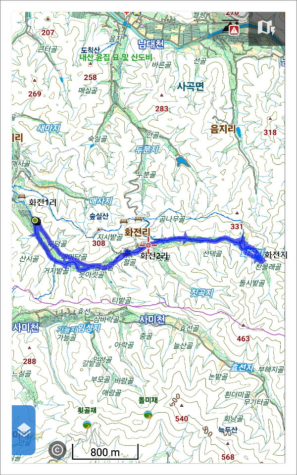 화전1리 - 화전2리 - 화전지(화전저수시) - 화전2리 - 화전1리(7.62km)