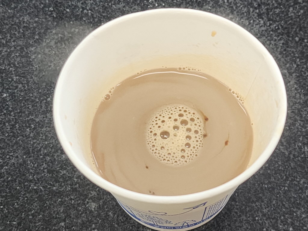 취사장에 와서 아점을 먹습니다.