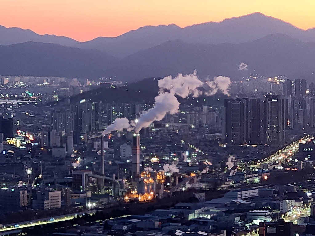 비산 염색공단 열병합 발전소 흰 수증기가 피어 오르고 있고 그 앞 ktx 서대구 역사의 불빛이 밝습니다.