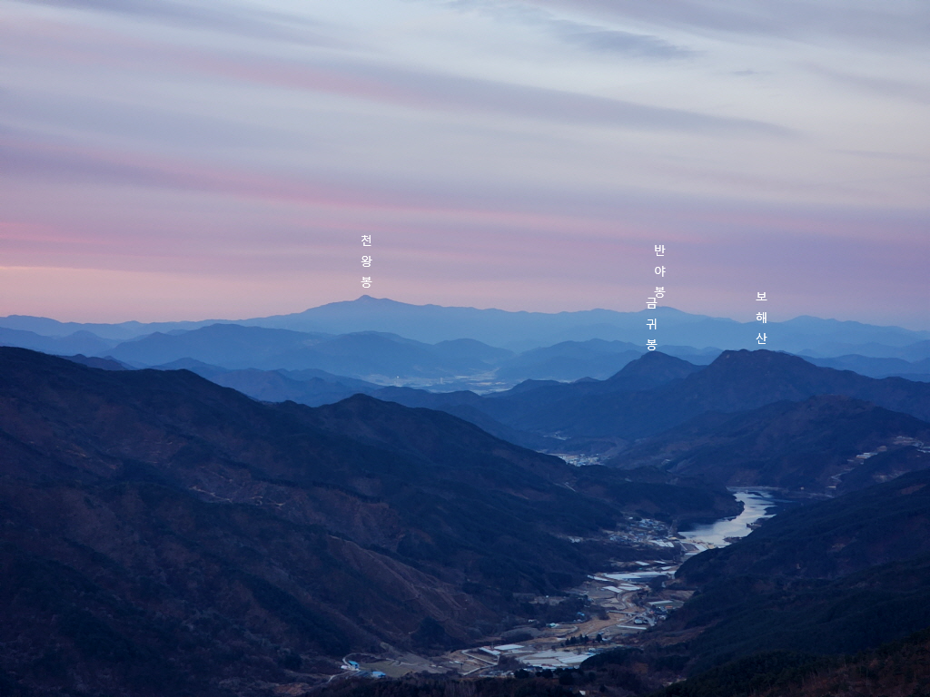 가북저수지뒤에 금귀봉과 보해산, 제일 뒤에 지리산