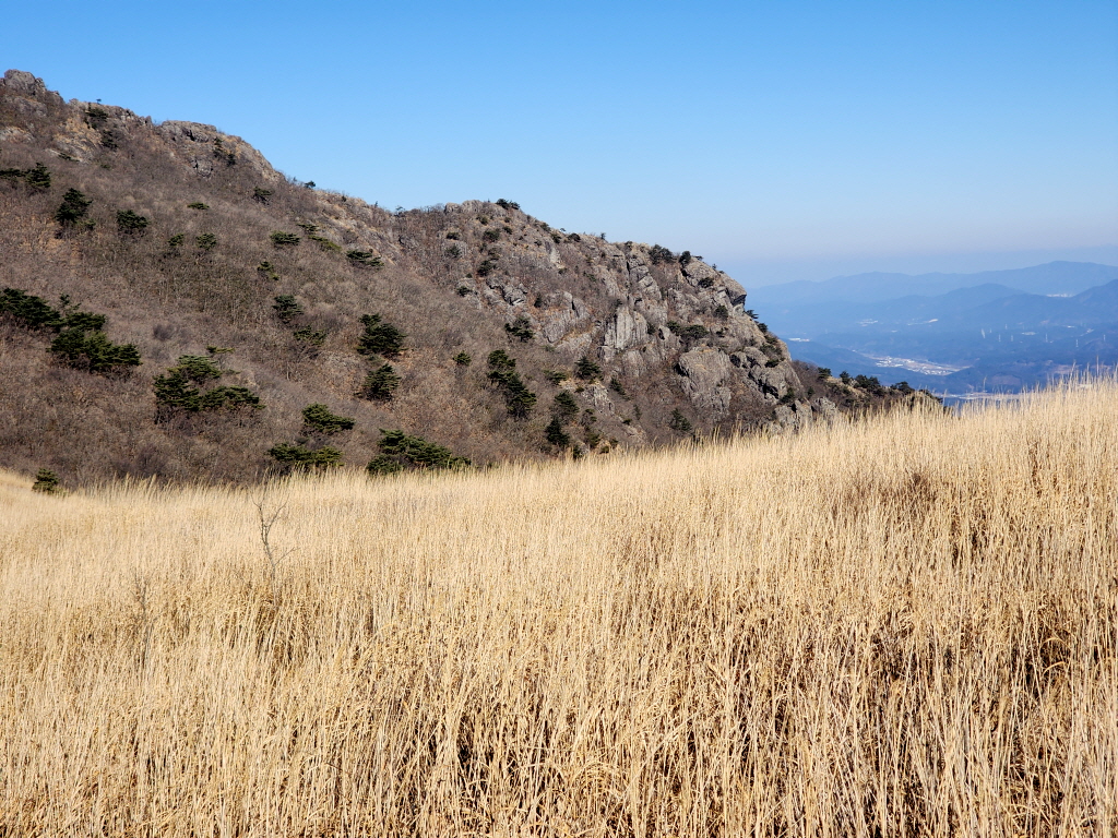 이 늪지를 둘러싸고 있는 것이 단조성터이다. 억새군락지 넘어로 긴 띠를 풀어놓은 듯한 석성터는 신라시대 때 축조