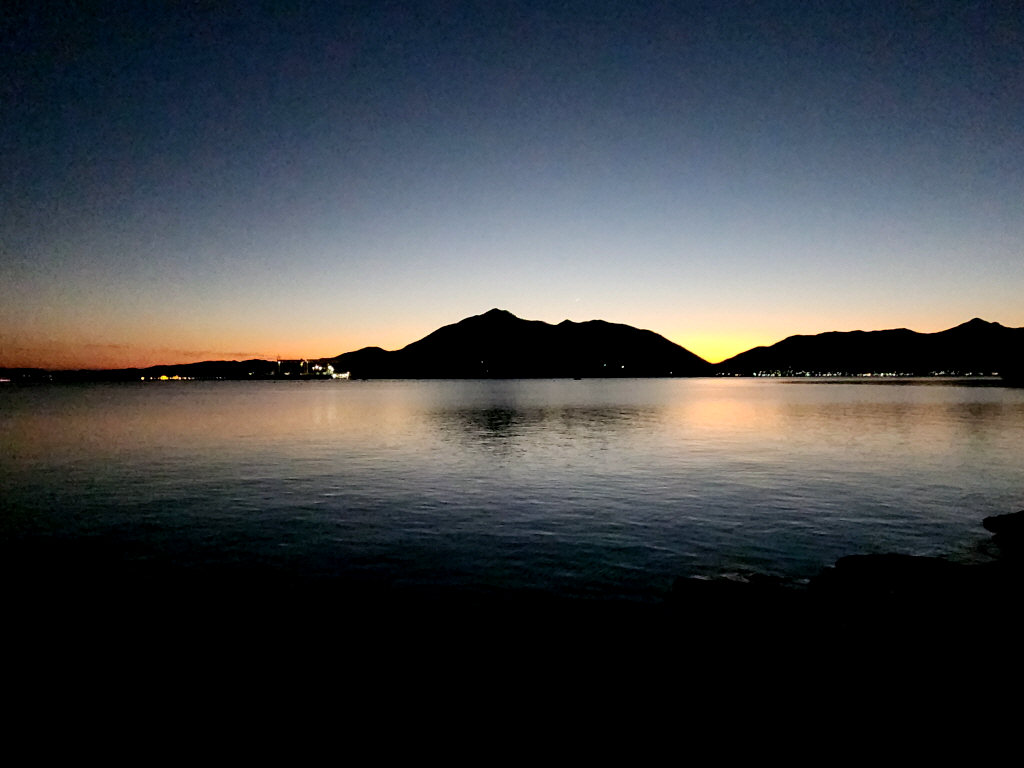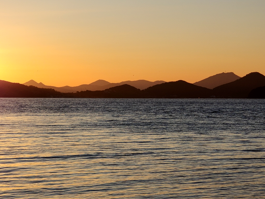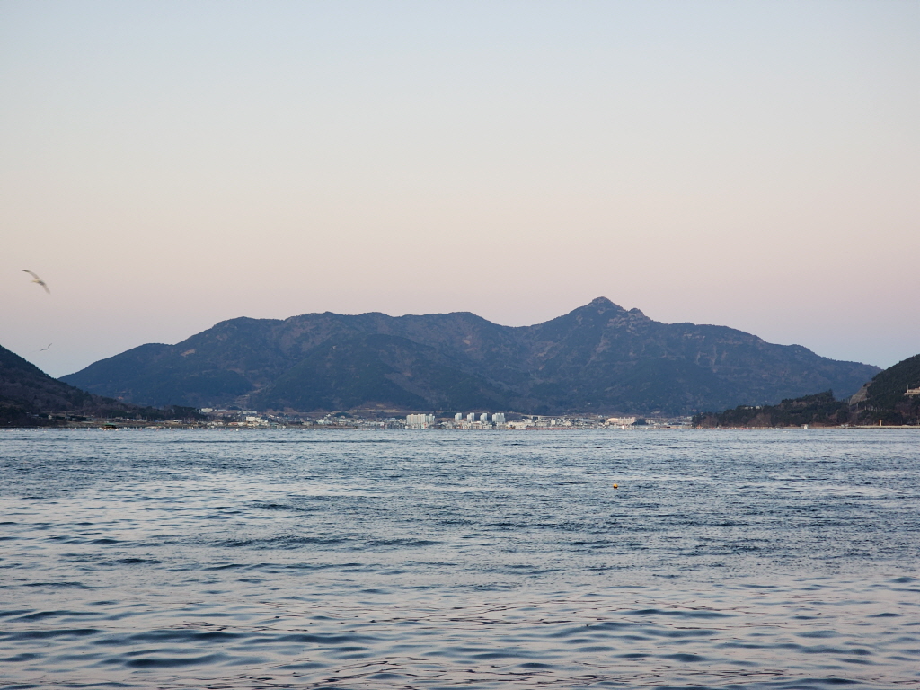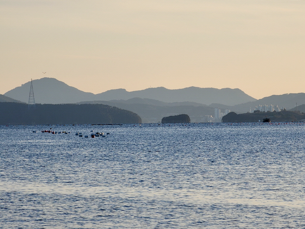 바다건너 통영 면화산 너머로 곧 해가 떨어질듯