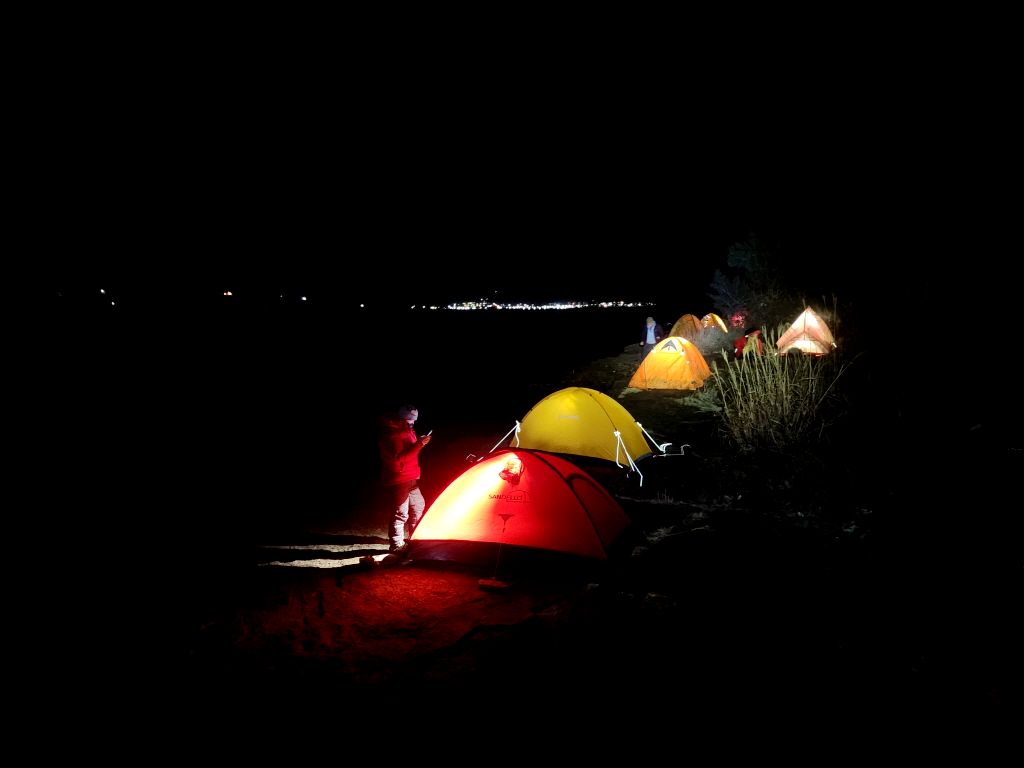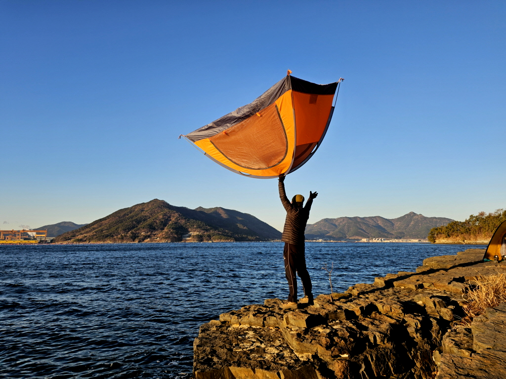 바람이 불어 텐트를 던지지는 못하고 들고서 한컷