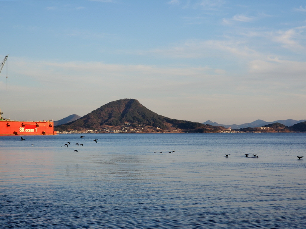 바로 아래가 거류면, 정면에 보이는 섬이 가조도, 가조도 뒤가 거제, 우측에 보이는 산이 면화산이다.>
