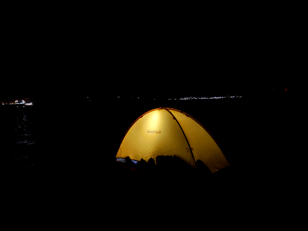 왼쪽 통영 면화산, 가운데 고성 거류산, 오른쪽 텐트