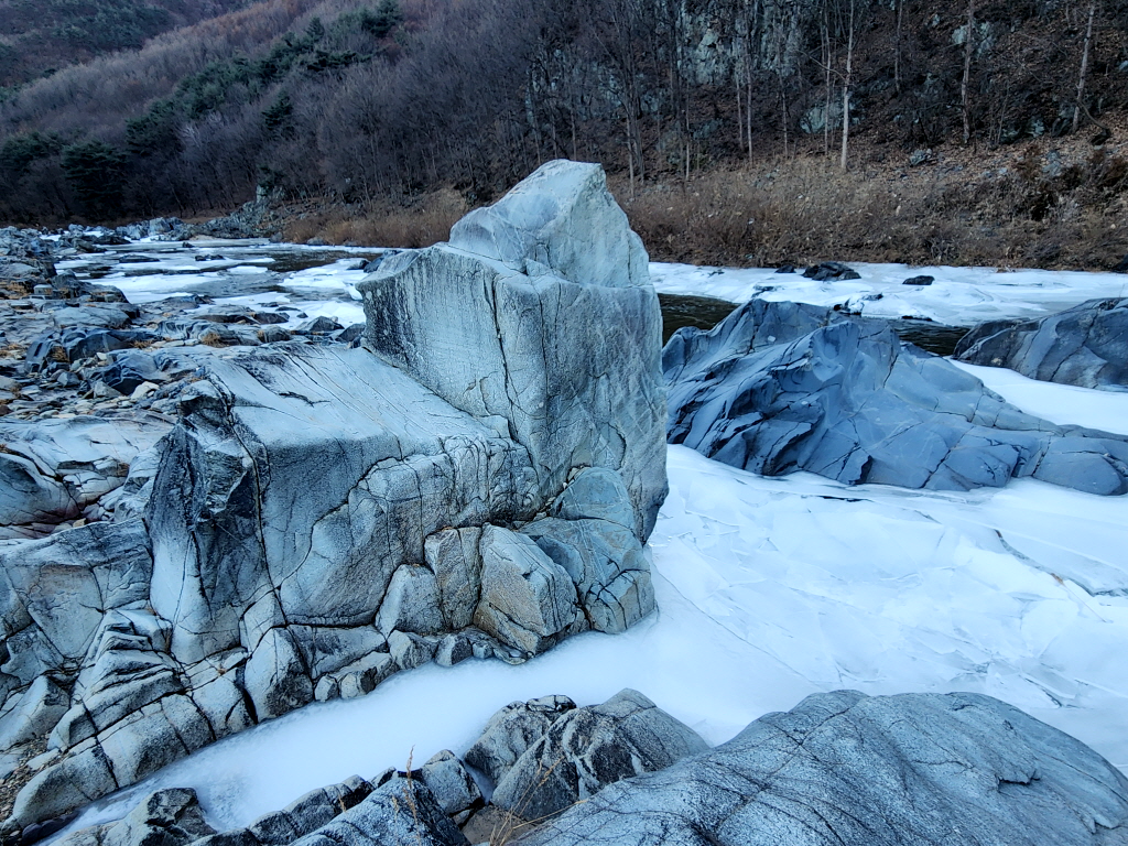 눈부신 바위들이 장관을 이루며 연이어 발달합니다. 포트홀(돌개구멍)은 계곡의 흐름에 따라 오랜 시간동안 풍화되고 침식되어