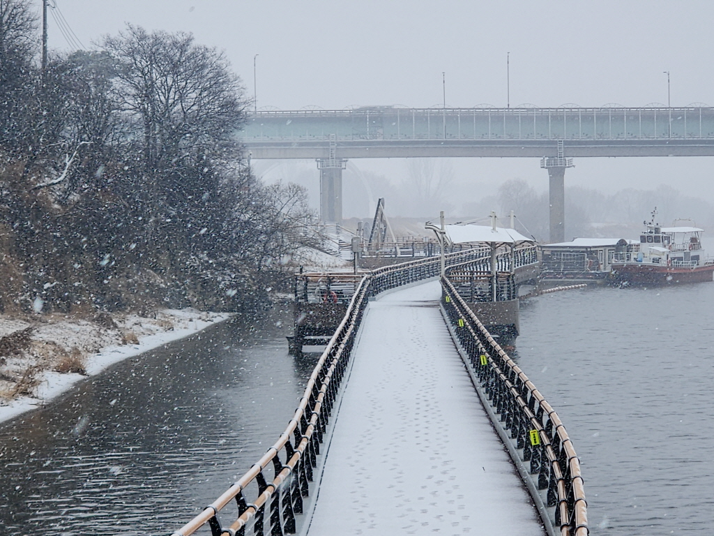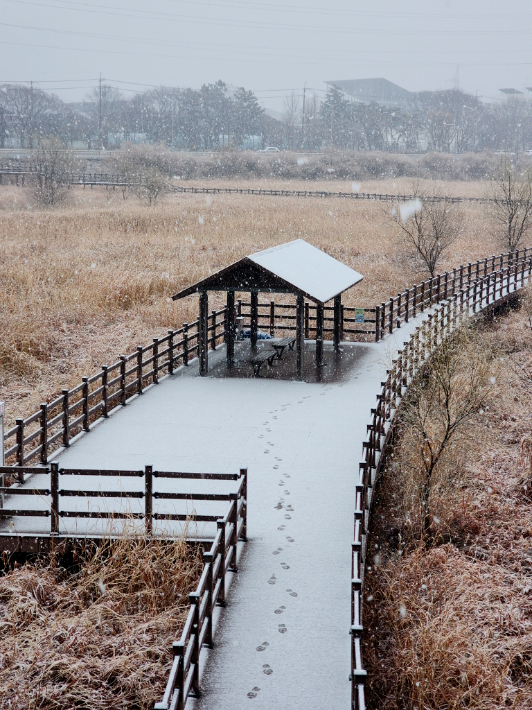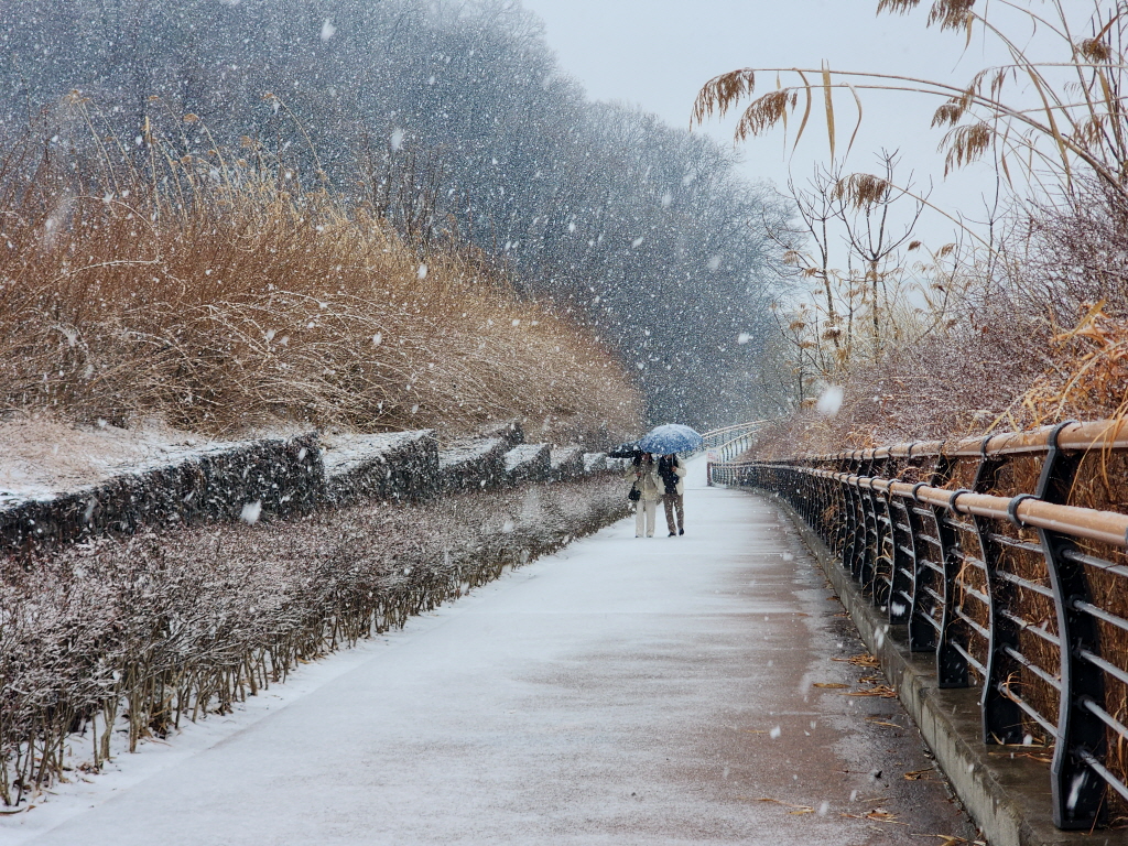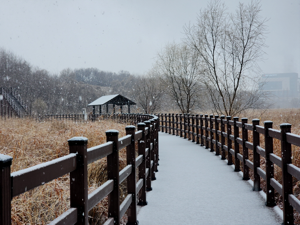 눈 맞으며 대명유수지에서 화원동산까지 6.5km를 걷고 귀가합니다.