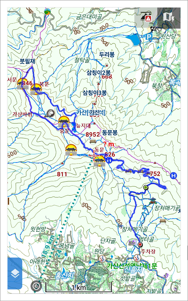 ◈ 산행코스 : 주차장 - 임도 - 동문 - 관아터 - 늪지대 - 북문 - 서문 - 가산바위 - 중문 - 동문 - 임도 - 주차장