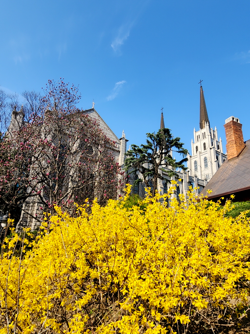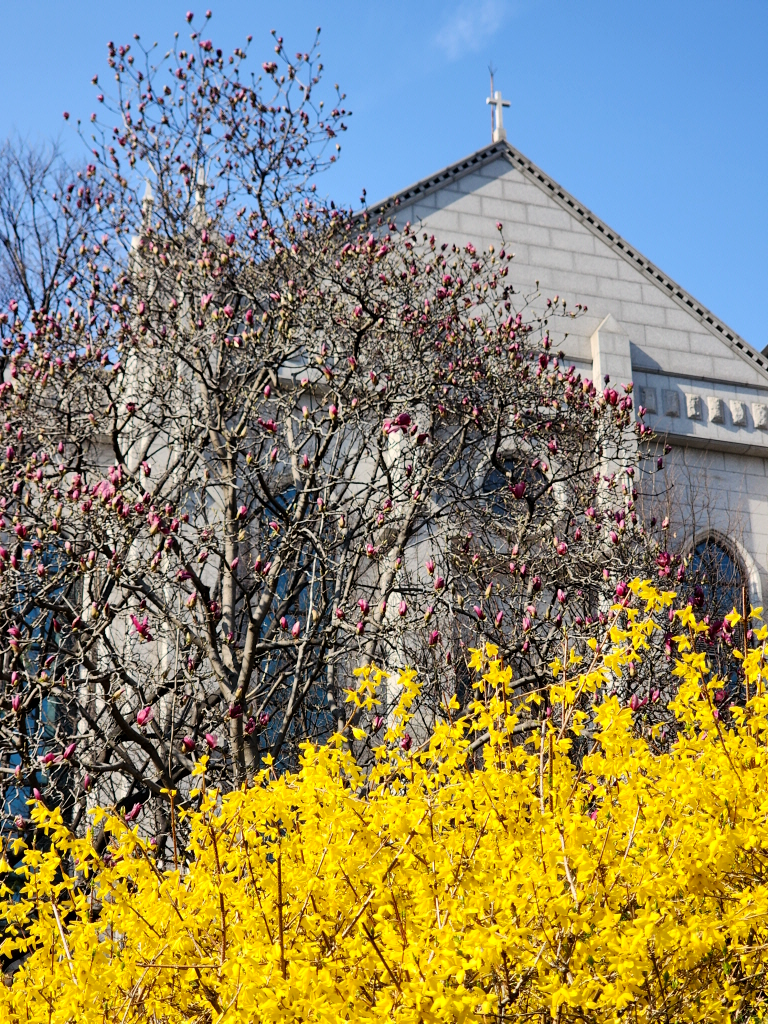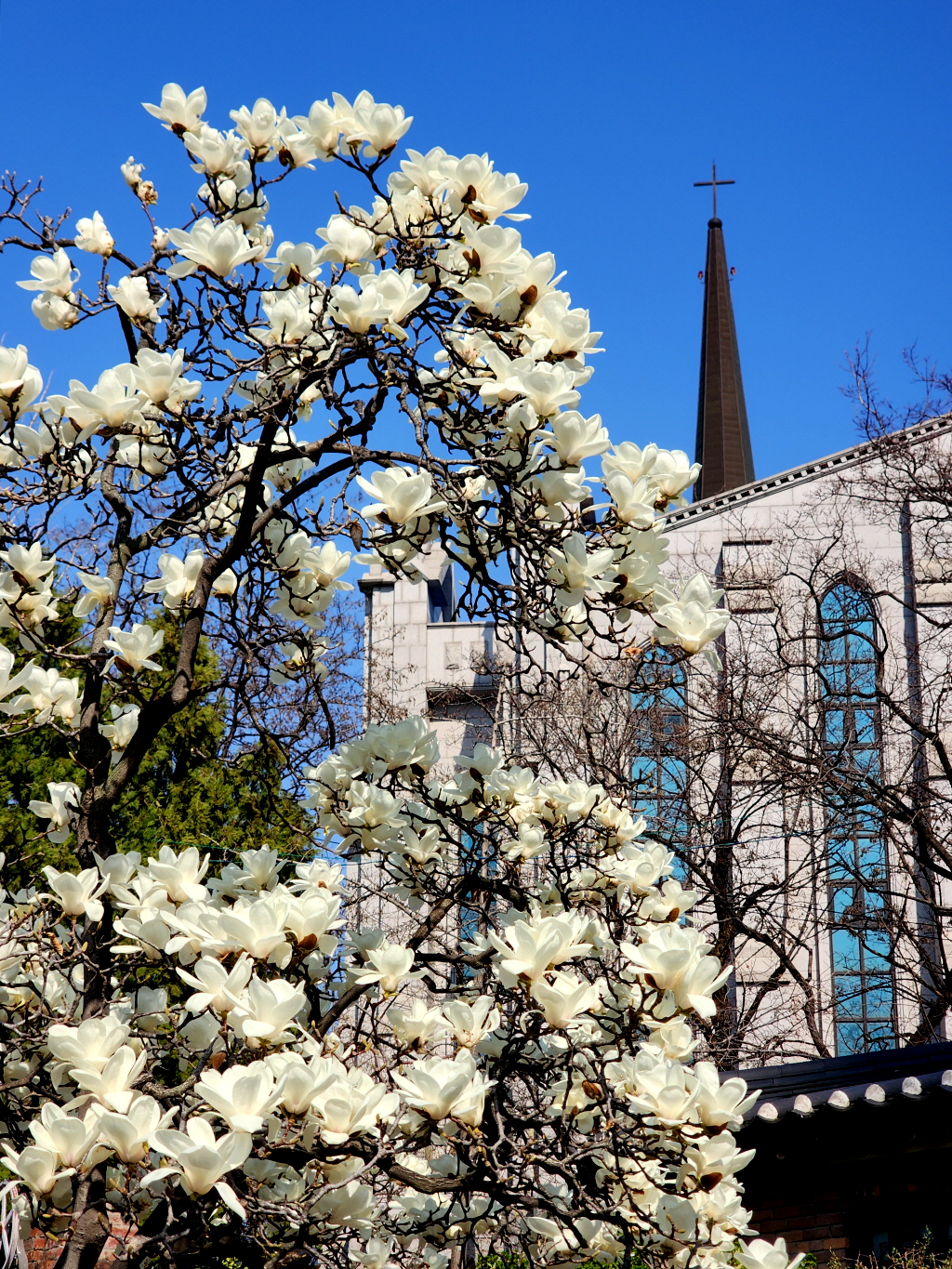 이렇게 보면 하얀 목련 뒤로 제일교회의 첨탑이 멋진 배경이 되어 인생샷 포토존이 되는