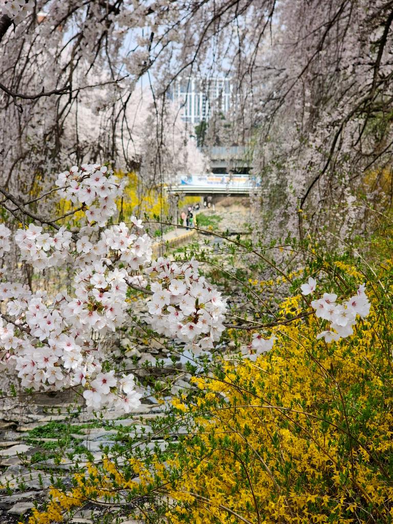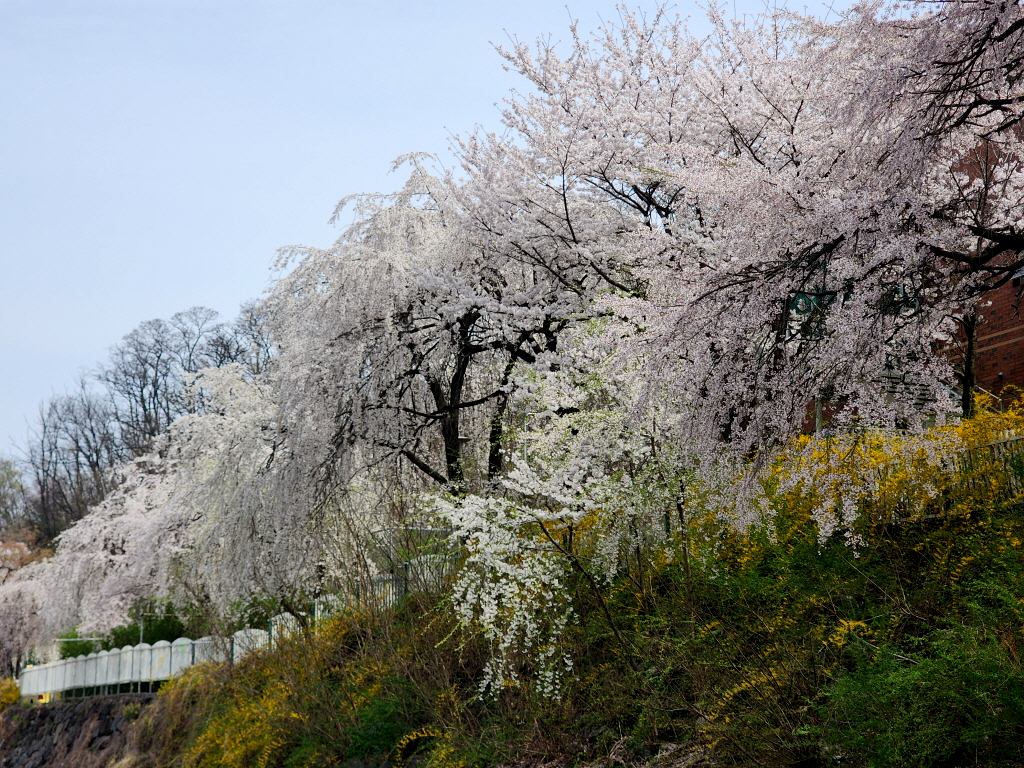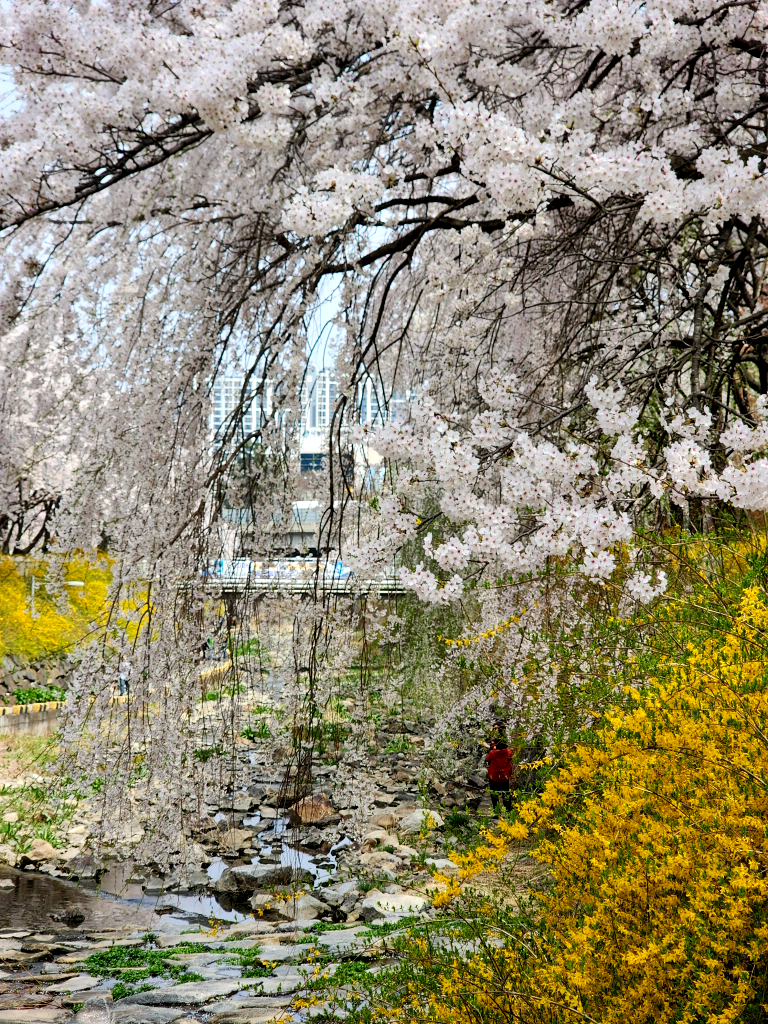 수양벚꽃 아래에는 개나리가 활짝 피어있는