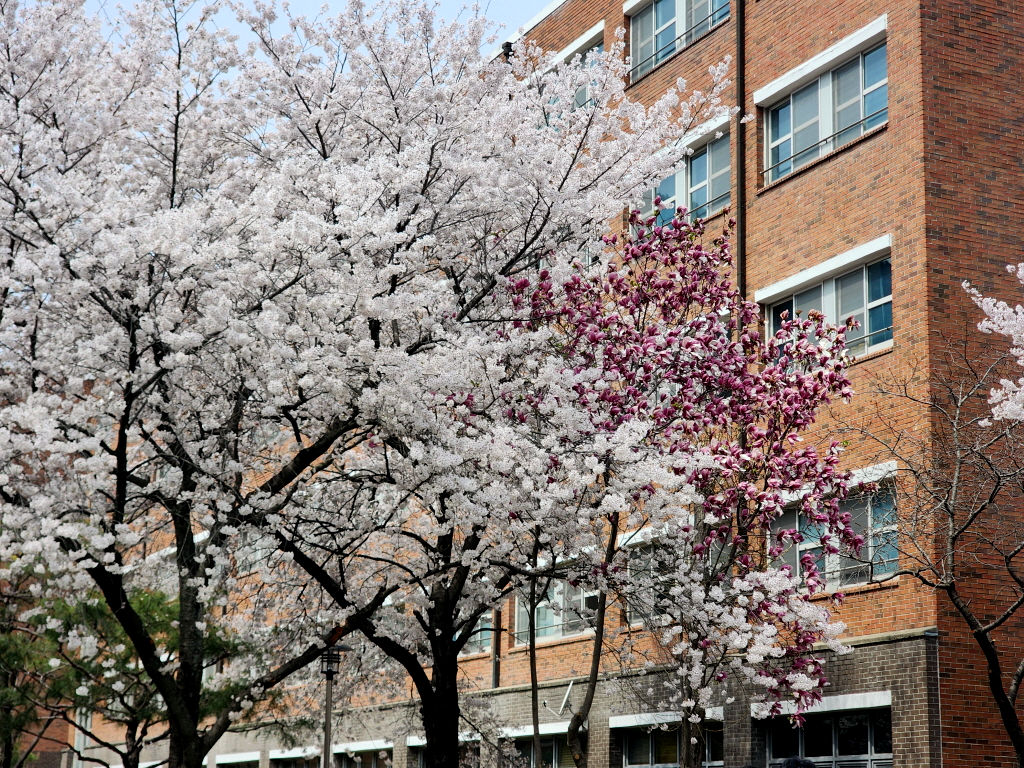 천 왼쪽은 일반 벚꽃, 오른쪽은 수양벚꽃이